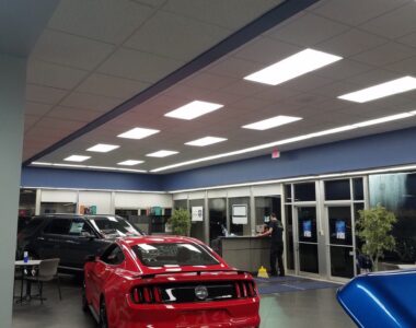 Our team took great caution working around these vehicles. Updating these troffers was no easy task. Our skilled technicians carefully brought in their ladders and got the job done with no harm to this dealership’s show room goods. One by one, through the night they worked hard to give this project their all. Now the show room lighting is as beautiful as the vehicles.